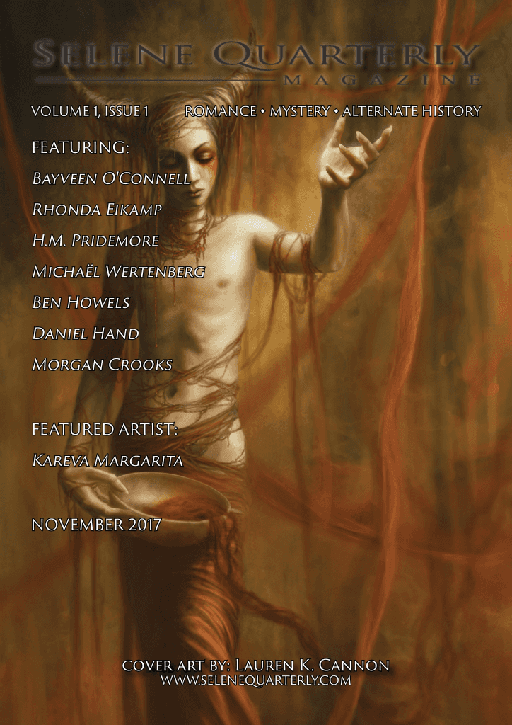 Selene Quarterly Magazine was a speculative romance, mystery, and alternate history periodical launched in 2017. All contributors received payment and a free digital copy (.epub, .pdf, or .mobi for Kindle™) of their issue. SQM became a semi-pro qualifying market according to the SFWA in 2019. In 2019, SQM also became an HWA and MWA qualifying market. Our online ISSN is 2637-7349. Our print ISSN is coming soon.